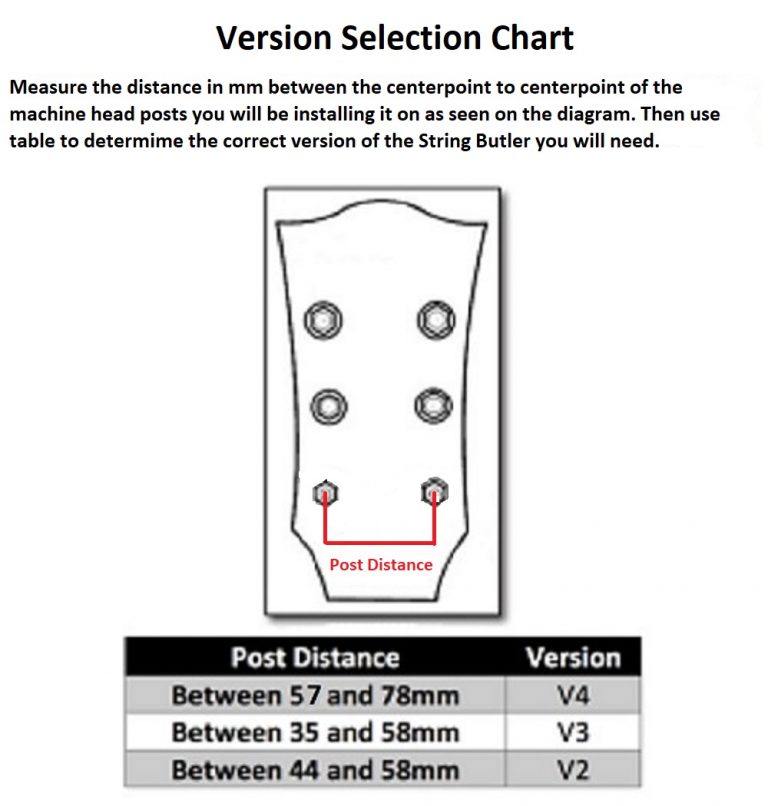V2, V3 & V4 models are supplied two PVC washers to protect the finish from scratches (except in the string Butler acrylic “models). These PVC discs are placed over the tuning pins and placed under “The String Butler”. Check on the dimensional data in millimeters (mm) required from centre post to centre post. Note for V3 Clear only the maximum string gauge should not exceed .10 -.46 for electric & .12 -.53 for acoustic guitars. Other versions there is no restrictions on string gauge.